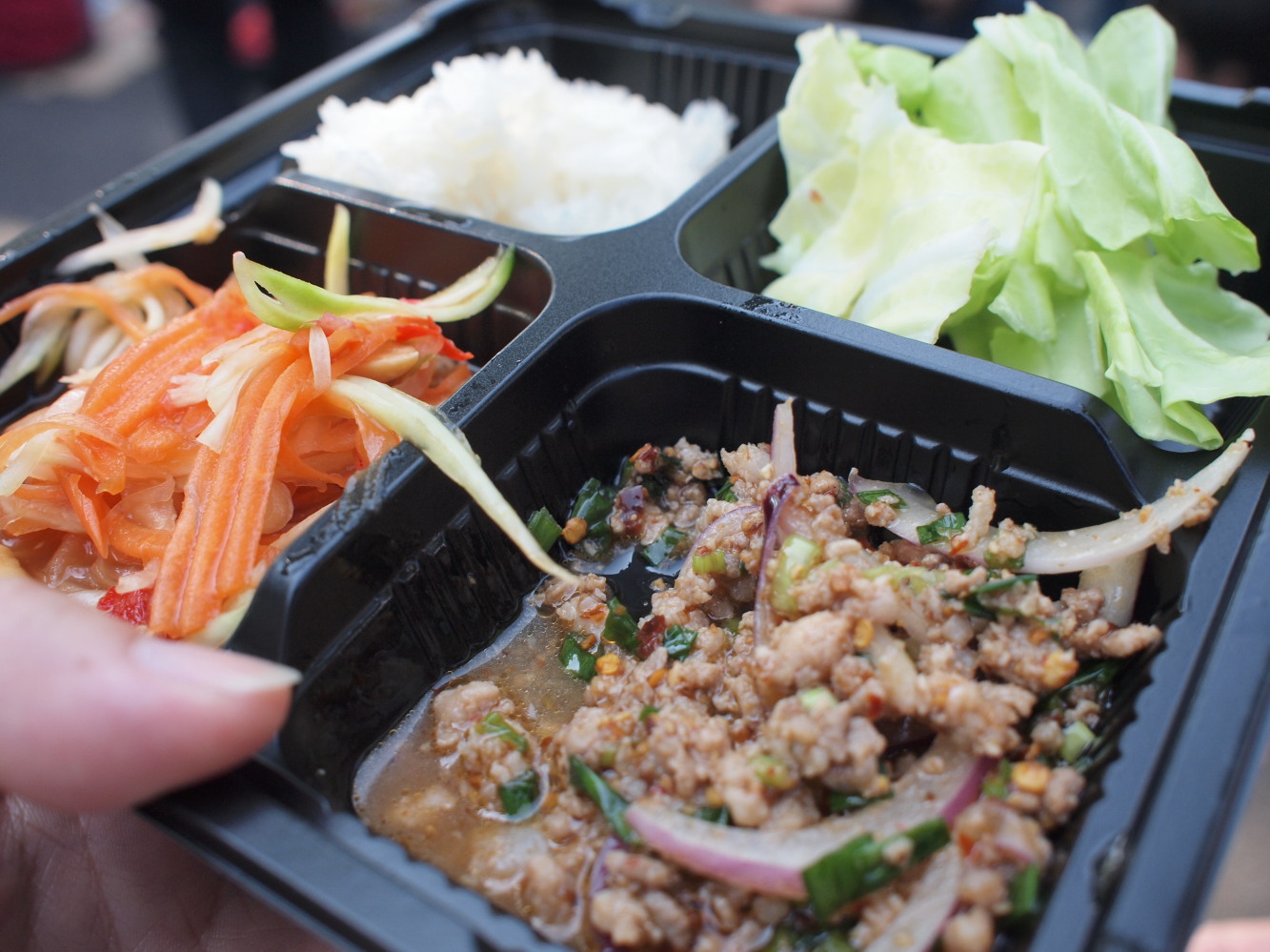 豚肉のラープ、ソムタム(パパイヤサラダ)、もち米。